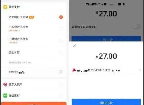 記者分別用數字人民幣支付了美團、餓了么的訂單,使用方式與電子支付工具相似。首先為數字錢包充錢,目前有兩種方式:從手機銀行轉入、銀行卡充錢,然后將美團、餓了么添加進子錢包進行授權,之后打開美團、餓了么正常下單,在“選擇付款方式”處選擇數字人民幣子錢包,即可完成數字人民幣線上支付。