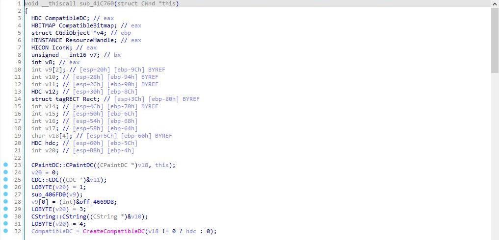 偽代碼包含了使用的變量和調用的函數和相應的參數等,雖然可讀性不是很高,但已經在一定程度上體現出了程序內部的邏輯結構,包括一些字符串都會自動以明文方式顯示,對提取二進制文件內部的信息起很大的幫助。