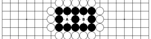 如下圖,黑棋有一只真眼。當周圍完全被包圍住,即使白棋走在A位,黑棋還有B處這個鼻孔出氣。