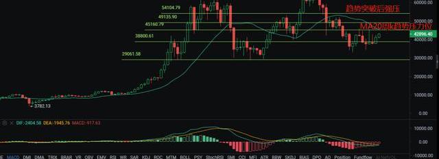 白話:目前在周線水平上突破20日均線是比較健康的。后面估計會直接在45000刀就突破K20日均線。而一旦能夠突破周線K20日均線,行情將會大幅度反彈甚至創出新高。這和利弗莫爾前面說的那樣,徹底反轉行情了。