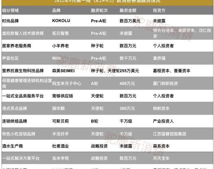 時尚品牌「KOKOLU」、聲音社區「With」、營養抗衰生物科技品牌「森美SEIMEI」、連鎖烘焙品牌「可斯貝莉」、特色小吃連鎖品牌「半湯抄手」獲得千萬級融資;