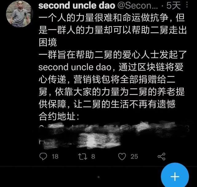 2022年7月28日,推特賬號@seconduncledao發布消息稱“一群旨在幫助二舅的愛心人士發起了二舅幣,通過區塊鏈將愛心傳遞”,并附上了合約地址,表示自己發行了名為“二舅幣”的虛擬幣,該項目的收益將“捐贈給二舅作為養老保障”。