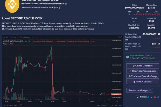 “二舅”這個標簽,無疑是博眼球的“熱點事件”。根據二舅幣的發行者@seconduncledao公布的內容顯示,SUC交易池創建于2022年7月27日,正是“二舅”討論度達到頂峰的時間。發行總量10000億枚,橫向對比與其關聯的、發行量為2億枚的幣安幣,發行數量大的離譜,而每個二舅幣的最高幣值僅有0.00000003197美元。