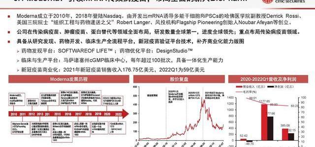 Moderna成立于2010年,2018年登陸Nasdaq。由開發出mRNA誘導多能干細胞RiPSCs的哈佛醫學院副教授DerrickRossi、美國三院院士“組織工程與藥物遞送之父”RobertLanger、風投機構FlagshipPioneering創始人NoubarAfeyan等創立。公司在傳染病疫苗、腫瘤疫苗、蛋白替代等領域全面布局,研發數量全球第一,進度全球領先;重點布局傳染病疫苗領域。具備從研究發現、藥物開發、臨床生產全流程平臺,新冠疫苗驗證平臺技術,補齊商業化能力版圖。藥物發現平臺:SOFTWAREOFLIFE;藥物優化平臺:DesignStudio。臨床與生產平臺:馬薩諸塞州cGMP臨床中心,每年超過100批次,具備一體化生產能力。新冠疫苗商業化:2021年新冠疫苗銷售收入176.75億美元,2022Q1為59億美元。