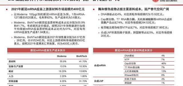 2021年新冠mRNA疫苗上游原材料市場規模約400億元。以Moderna100g/劑的新冠mRNA疫苗為例,1劑mRNA1273售價約20美元,毛利率82%,生產成本約為3.6美元;Moderna、BioNTech新冠疫苗原材料成本占比分別為55.9%和41.7%,考慮到其定價接近,按照2021年銷售額進行加權平均得到mRNA疫苗原材料成本占比約為51%,對應每劑mRNA疫苗生產成本1.84美元;Moderna、BioNTech新冠疫苗2021年銷售量分別為8.07億劑、26億劑,合計約34億劑,對應上游原材料市場規模約63億美元,按照2021年度期末匯率換算,約為400億人民幣。