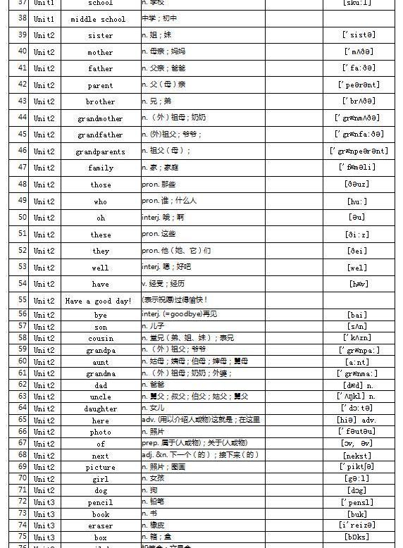 48Unit2thosepron.那些49Unit2whopron.誰;什么人50Unit2ohinterj.哦;啊51Unit2thesepron.這些52Unit2theypron.他們53Unit2wellinterj.嗯;好吧54Unit2havev.經受;經歷55Unit2Haveagoodday!(表示祝愿)過得愉快!56Unit2byeinterj.(=goodbye)再見57Unit2sonn.兒子58Unit2cousinn.堂兄;表兄59Unit2grandpan.祖父;爺爺60Unit2auntn.姑母;姨母;伯母;嬸母;舅母61Unit2grandman.祖母;奶奶;外婆;62Unit2dadn.爸爸n.63Unit2unclen.舅父;叔父;伯父;姑父;舅父n.64Unit2daughtern.女兒65Unit2hereadv.(用以介紹人或物)這就是;在這里adv.66Unit2photon.照片67Unit2ofprep.屬于(人或物);關于(人或物)68Unit2nextadj.&n.下一個;接下來69Unit2picturen.照片;圖畫70Unit2girln.女孩71Unit2dogn.狗72Unit3penciln.鉛筆73Unit3bookn.書74Unit3erasern.橡皮75Unit3boxn.箱;盒