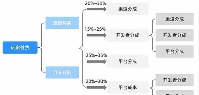 前期通過玩家線上付費,游戲付費模式可分為直接付費與月卡訂閱,所獲利潤由游戲開發商、游戲平臺、推廣渠道與游戲發行成本等分配。游戲抽成屬于較為傳統的盈利方式。