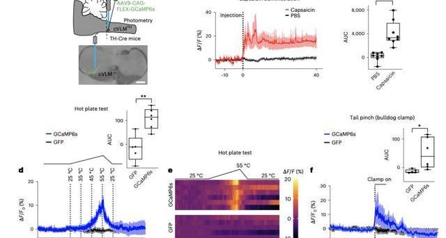 為了進一步驗證上述結果,研究人員對cVLMTH神經元進行了在體鈣成像記錄。結果顯示,辣椒素注射、傷害性熱刺激和機械刺激均顯著升高了cVLMTH神經元鈣信號。
