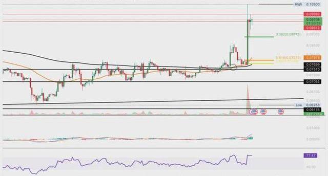 4小時圖已經形成黃金交叉,這意味著短期內趨勢已經被看漲確認。此外,MACD直方圖向上走高,MACD線看漲交叉。與此同時,RSI處于嚴重超買區域并接近看跌背離。如果狗狗幣現在修正,下一個重要的斐波那契支撐已經在0.08875美元和0.078美元左右等待。