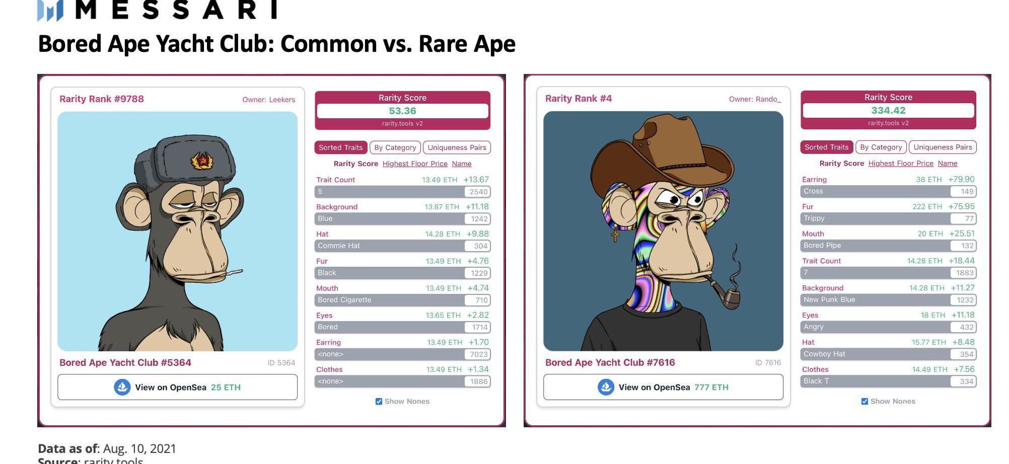 幾乎在第一批作品被鑄造出來的時候,它們就出現在二級市場上。最受歡迎的市場在這篇文章中討論過。在二級市場上,一個NFT的稀有性成為決定價格的重要因素。由于"普通"NFT出現的頻率更高,從稀缺性的角度來看,它們的價值自然較低。普通作品的銷售價格實際上是購買特定收藏品的NFT的最低價格,也稱為"地板價"。