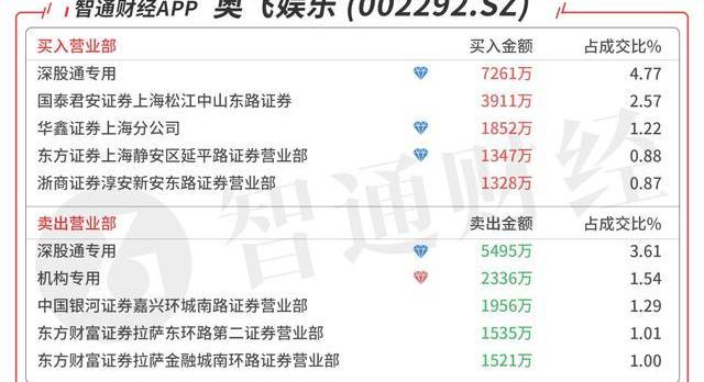 奧飛娛樂(002292.SZ):多主力現身龍虎榜,機構與游資出現分歧,機構席位賣出2336萬元,深股通對倒賣出1766萬元,買三是量化基金的席位買入1779萬元,當日凈買入4986萬元,該股今日突破所有均線,持續上漲需放量。