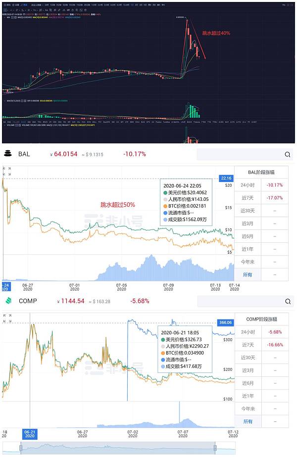 以近段時間很火爆的COMP、BAL以及DOGE為例,當前均出現了大幅的跳水回調,其中DOGE單純是由于國外抖音上的一個主播視頻受到關注,而后迎來熱炒,但前后不過一周時間已經跳水回落超過40%。而COMP和BAL均是DeFi上的熱門項目首發代幣,到目前為止均回調超過50%。