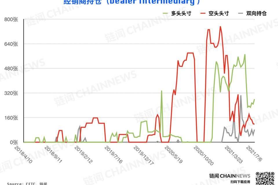 分項數據上來看,規模最大的經銷商持倉多頭頭寸自59張上升至70張,空頭頭寸自88張同步上升至130張,多空雙向持倉自43張降至0張。經銷商賬戶又一次進行了多空雙向同步增持,不過由于已對沖倉位被清零,因此整體持倉變化不大,這類賬戶在以太坊上也沒有表達出特別明確的單邊傾向。