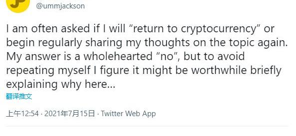 Palmer在第一條推文中稱,“經常有人問我是否會‘回歸加密貨幣領域’,或者再度開始定期分享我對這個話題的想法。我的回答是‘絕不’。而為了避免再三重復我的上述立場,我認為有必要在此簡要解釋一下原因……”