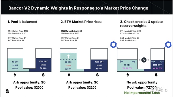 3.為了防止流動性提供商產生損失,Bancor V2通過獲取預言機價格,并升級代幣池比重。怎么升級?在獲取預言機提供的市場價格之后,ETH的池價格也升至120美元,那么,這個時候10ETH的代幣池價值為1200美元,1000BNT為1000美元,整個代幣池價值為2200美元,跟市場價值趨于一致。而更新之后,10ETH的占據代幣池的54.5%的比例,而BNT占據44.5%的比例。通過這樣的調整,作為流動性提供商,就不會因為ETH上漲產生“無常損失”。關于什么是無常損失,可以參考藍狐筆記之前的文章《Bancor 有機會超越Uniswap嗎?》