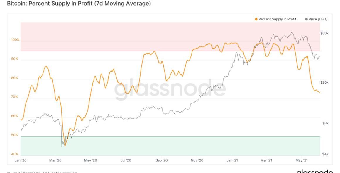 受到BTC劇烈調整的影響,流通中籌碼的盈利狀態在近期也有較大變化。根據glassnode的統計,6月1日,雖然BTC流通量中仍有約73.07%的代幣處于盈利狀態,但這一比例在最近30天內已經從5月2日的89.83%下降了近16個百分點,較2月20日創造的年內峰值99.26%下降了約26個百分點,并創下了2020年7月7日以來330天內的最低值。