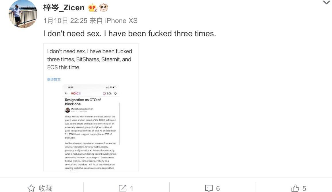 “截至2020年12月31日,我辭去了Block.one首席技術官一職。我將繼續致力于創建自由市場、自愿解決方案,以確保所有人的生命、自由、財產和正義。我不知道下一步到底是什么,但我傾向于構建更多的抗審查技術,我將集中精力于創建人們可以用來確保自己的自由的工具。”