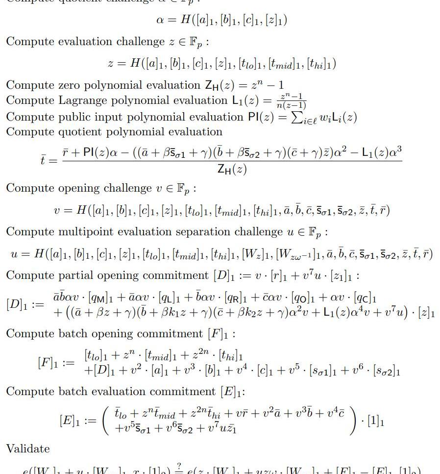 上圖表示了PLONK算法里驗證方V的一些操作,主要重新生成相關的參數,確保證明方P沒有作惡。需要說明的是: