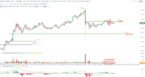 今天的主要觀點和昨日沒有太大不同,認為短期走勢依然是以震蕩為主,主要的上漲趨勢未破壞,但是前天那輪劇烈的砸盤對短線走勢必然會有一定負面影響。所以立足長遠的建議就是以持倉看漲為主,但不急著去加倉。短期操作主要留意靠近強弱分界線-10670的區域,如果幣價回落靠近該區域,或是不錯的低吸買入機會,看到漲速比較快的陽線不要輕易追漲,在這種縮量狀態下漲勢不容易持續,就像圖中圈出的那根K線一樣。