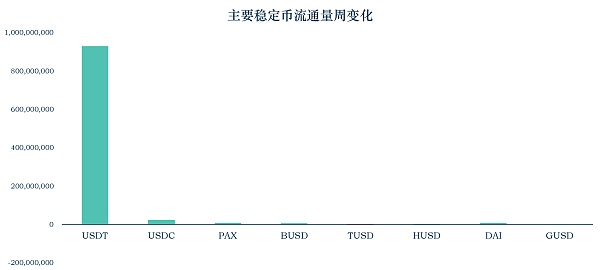 過去一周,USDT增發了6次,流通量增加9.3億。其中在以太坊上增發了4次,共4.8億USDT;在Tron上增發了2次,共4.5億USDT。USDC、PAX、BUSD、HUSD、DAI、GUSD的流通量分別增加2399萬、809萬、631萬、391萬、899萬、84萬。TUSD的流通量減少239萬。