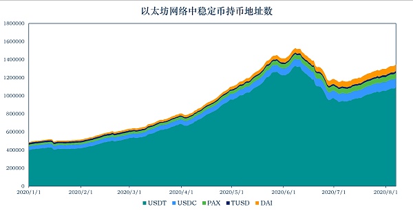 USDT、USDC、PAX、TUSD、DAI的持幣地址數分別上升38624個、7331個、269個、885個、5683個。