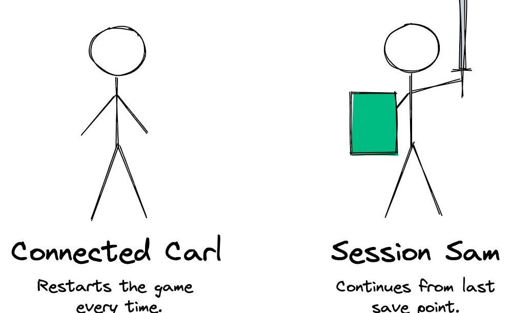當應用程序想要與用戶進行更豐富的上下文交互時,例如加載他們的偏好或私人聊天消息,我們需要首先確保我們正在與帳戶背后的實際密鑰持有者交談,而不是假裝控制帳戶的人。“連接錢包”不提供此保證,但使用以太坊登錄(SIWE)提供。換句話說,我們需要對用戶進行身份驗證以與他們建立會話以安全地讀取和寫入他們的數據。對于這個例子,我想介紹一下ConnectedCarl和SessionSam: