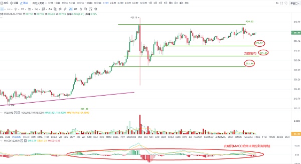 雖然幣價于410阻力處受阻會做,但是回落幅度很有限,也沒有持續性,尤其是圖中所圈出的區域,動能指標MACD幾乎一直沒有跌破零軸。零軸是MACD的強弱分界線,一直守在零軸上方運行,意味著ETH中主動性賣出力量確實很小。而且這幾天雖然處于偏盤整的狀態,但是低點不斷抬高的特征還是很明顯,所以短線也繼續以看漲為主,不輕易做空,除非幣價再次出現快速拉升后滯漲的跡象。