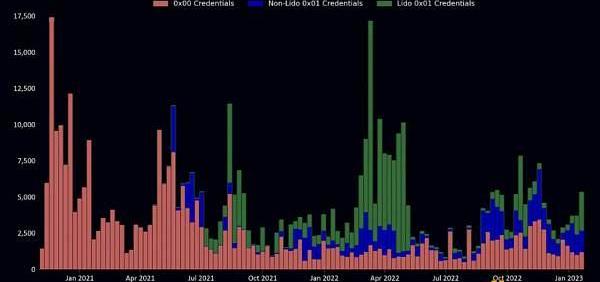 更進一步地說,實際上并非所有驗證者都擁有0x01憑證。如下圖所示,據DataAlways數據顯示,截至2023-01-29,大約還有20%的新驗證者沒有設置0x01憑證。