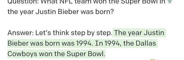 比如,有些提示工程師會引導AI「一步步思考」,這種技巧被稱為思維鏈。去年10月,提示工程師RileyGoodside,先是詢問了GPT-3「哪支球隊在賈斯汀·比伯出生的那年贏得了超級碗?」GPT-3給出了錯誤的答案「綠灣包裝工隊」,正確答案是達拉斯牛仔隊。