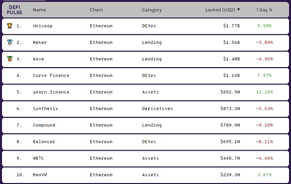 圖:Uniswap總鎖倉量排名第一(截至2020年9月4日)