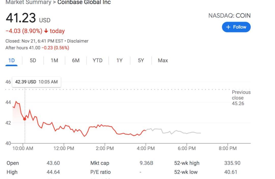 作為「加密貨幣第一股」,“內外交困”的Coinbase股票也被嚴重拖累,紐約時間11月21日,Coinbase股價收盤下跌超過8%,盤中創下歷史新低40.61美元。在以超過850億美元的市值上市19個月后,Coinbase市值首次跌破100億美元大關,超過四分之一的市值在過去四個交易日中蒸發。
