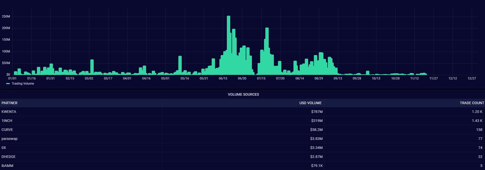 據Synthetix官網數據顯示,在原子交換完善后的一個月,Synths資產現貨交易量在以太坊主網暴漲至最高2.55億美元。今年以來,以太坊主網上Synths現貨總交易量僅Kwenta和1?inch相加就超過了10億美元,SNX的價格也在年中經過過一波不錯的上漲。