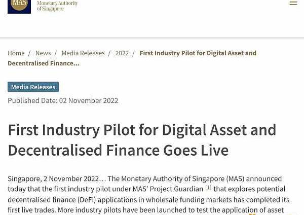 11月2日,MAS宣布,其ProjectGuardian的第一個探索批發融資市場中潛在DeFi應用的行業試點項目已完成首次實時交易。其中,星展銀行、摩根大通和SBIDigitalAssetHoldings針對由Token化新加坡政府債券、日本政府債券、日元和新加坡元組成的流動性池進行外匯和政府債券交易。該試點成功進行一筆涉及Token化日元和新加坡元存款的實時跨貨幣交易。
