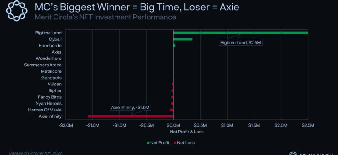 可視化后,MeritCircle的NFT投資表現似乎體現了帕累托原理。大部分的總利潤和損失可以歸因于少數投資。在這種情況下,MeritCircle的最大贏家是BigTime土地。同樣,MeritCircle的大部分虧損可歸因于少數投資。在這種情況下,罪魁禍首是AxieInfinity。