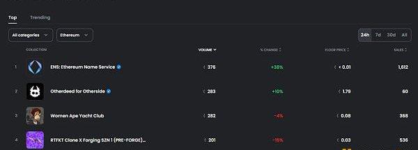 在OpenSea總共超5.5萬枚ETH的ENS域名交易量中,999Club和10kClub這兩個類別便近乎占據了近1/2的交易量,而其中10kClub近24小時的交易量已經超過350ETH,超過了BAYC、CryptoPunks等一眾藍籌登頂榜首。