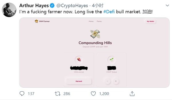 BitMEX創始人Arthur Hayes甚至發布推特宣布自己也成為了一個流動性挖礦者,并看好DeFi,助推牛市到來。