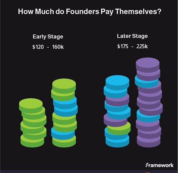 創始人的工資因多種因素影響而有很大差異,其中最顯著的因素是公司所處的階段。對于早期公司,創始人傾向于給自己支付最低工資,以維持舒適但基本的生活質量。對于大多數早期階段的創始人來說,年薪在10萬美元和17.5萬美元之間,最高年薪在13-16萬美元左右。這個數字對美國的創始人來說比較高,對國際創始人來說略低,主要取決于地點和生活成本。處于后期階段的公司的創始人獲得的工資更高,大約在17.5萬至22.5萬美元之間。