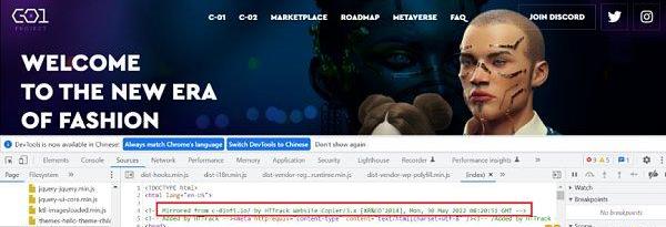 查看源代碼,發現這個釣魚網站直接使用HTTrack工具克隆c-01nft.io站點。對比兩個站點的代碼,發現了釣魚網站多了以下內容: