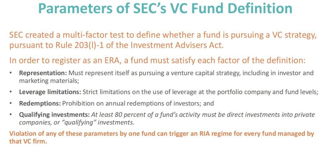 RIA的申請過程既漫長又昂貴,如果獲得批準,風險投資公司面臨更嚴格的合規要求,包括需要定期披露管理的資產。作為豁免報告顧問,風險投資公司不需要向美國證券交易委員會注冊為顧問。