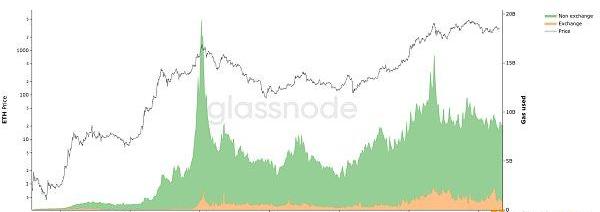 由于?gas市場競爭非常激烈,gas支出情況反映了用戶需求以及用戶分配給特定用例或協議的經濟價值。請注意,gas份額的下降可能還表示法幣或ETH支出的增加,反之亦然——為此,你可能需要參考?GlassnodeStudio中相應的絕對費用值。在本文中,我們只關注?gas份額,因為我們的目標是比較以太坊生態系統中用例的相對普遍性。