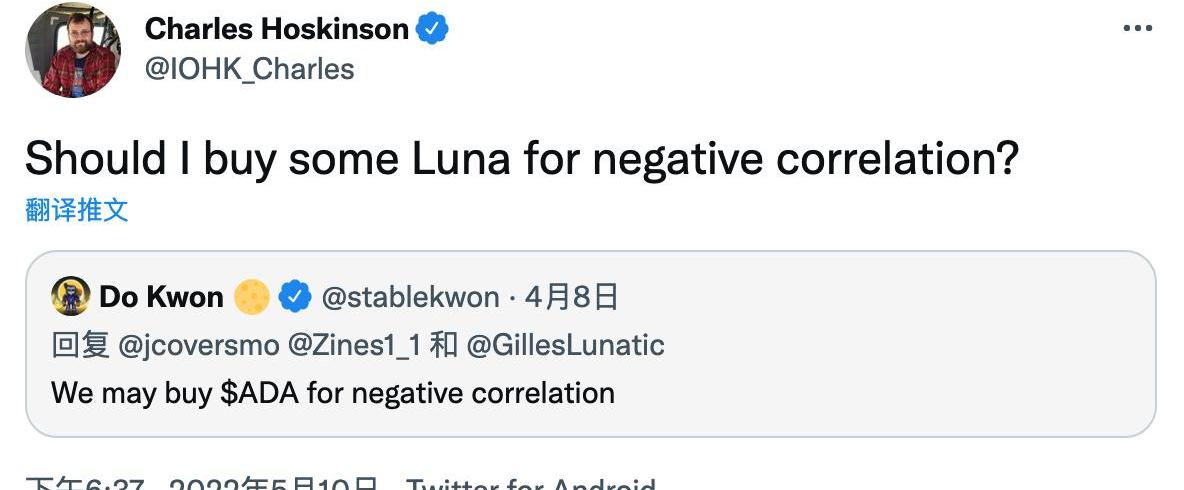 此外,有些人決定利用這個時刻進行一些甜蜜的報復。Cardano的創始人CharlesHoskinson引用了DoKwon一條舊的推文,DoKwon在里面草率評論了為什么要購買Cardano原生TokenADA:因為它與Terra自己的TokenLUNA呈負相關關系。隨著UST和LUNA下跌,Hoskinson以此回敬了DoKwon。