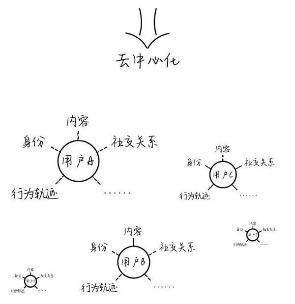 其優勢來自于底層技術結構的“中心化”支撐,所以解決“將所有權還給用戶”這個問題的核心是如何去掉中心化的平臺。但去掉中心化的平臺,在操作上并不是直接去解構它,而是從建設社交網絡圖譜之初,不再依賴于中心化平臺,而是自下而上的進行,這種感覺有點像“悄悄的進村,打槍的不要”。不依賴中心化的平臺,意味著從一開始用戶身份、內容以及社交關系等數據資源是分布、游離、碎片化的,不僅用戶之間相互失去關聯,用戶的數據也會跟用戶自己失去關聯。但這是去中心化邁出的第一步,如圖4-2所示。