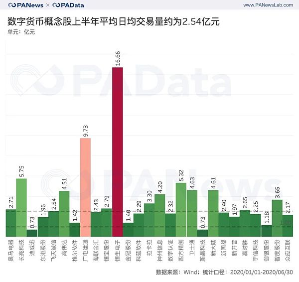 從數字貨幣概念股上半年的成交量來看,板塊整體不缺乏流動性,日均交易量的中位數為2.54億元。其中,恒生電子是流動性最好的個股,日均交易量達到了16.66億元,廣電運通的日均交易量達到了9.73億,也屬于流動性較好的概念股。其次,長亮科技和四方精創的日均成交量也都超過了5億,與其百億規模的市值匹配,基本為市場流動性的平均水平。