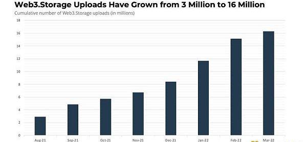 為了簡化在Filecoin上構建Web3應用程序,該團隊推出了Web3.Storage。它允許開發人員直接在Filecoin上存儲和檢索數據,而不是處理復雜的去中心化存儲網絡。它在多個Filecoin礦工和IPFS上的地理分布節點上冗余存儲數據,由Web3.Storage團隊運行。此外,該服務還提供無限數據的無限期免費存儲。FilecoinPlus機制的經濟性使這成為可能。從本質上講,去中心化存儲可以成為開發人員在Filecoin之上構建應用程序的商品。總體而言,Web3.Storage自推出以來經歷了穩定的增長,從2021年8月的300萬次上傳增長到2022年3月的1600萬次。