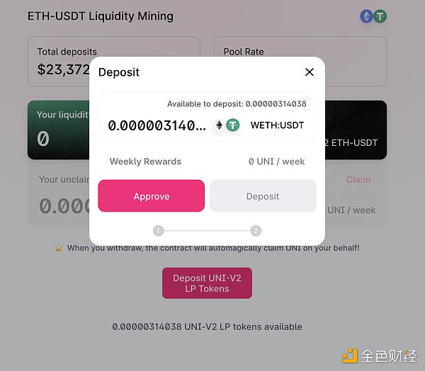 12.我們的目標是提供流動性后,進行流動性挖礦,也就是需要用流動性的證明去挖UNI,此時因為已經提供完流動性,當我們點擊最上方的UNI按鈕,在挖礦頁面的ETH-USDT選項中,可以發現在Deposit UNI-v2 LP的按鈕下面,出現了提供流動性代幣的具體數量。點擊deposit按鈕,就可以正式開始UNI的流動性挖礦了。