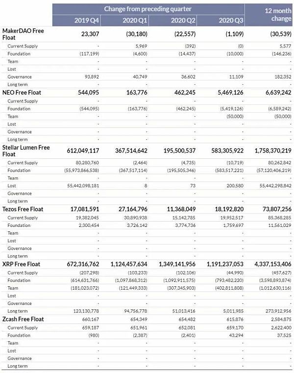 截止到2020年第三季度,加密資產市場自由流通量增加的凈值為11.7億美元,比上一季度增加的凈值(13.6億美元)下降14%。第三季度價值增長的最大貢獻者是BTC(4.02億美元),XRP(3.04億美元)和NEO(1.13億美元)。