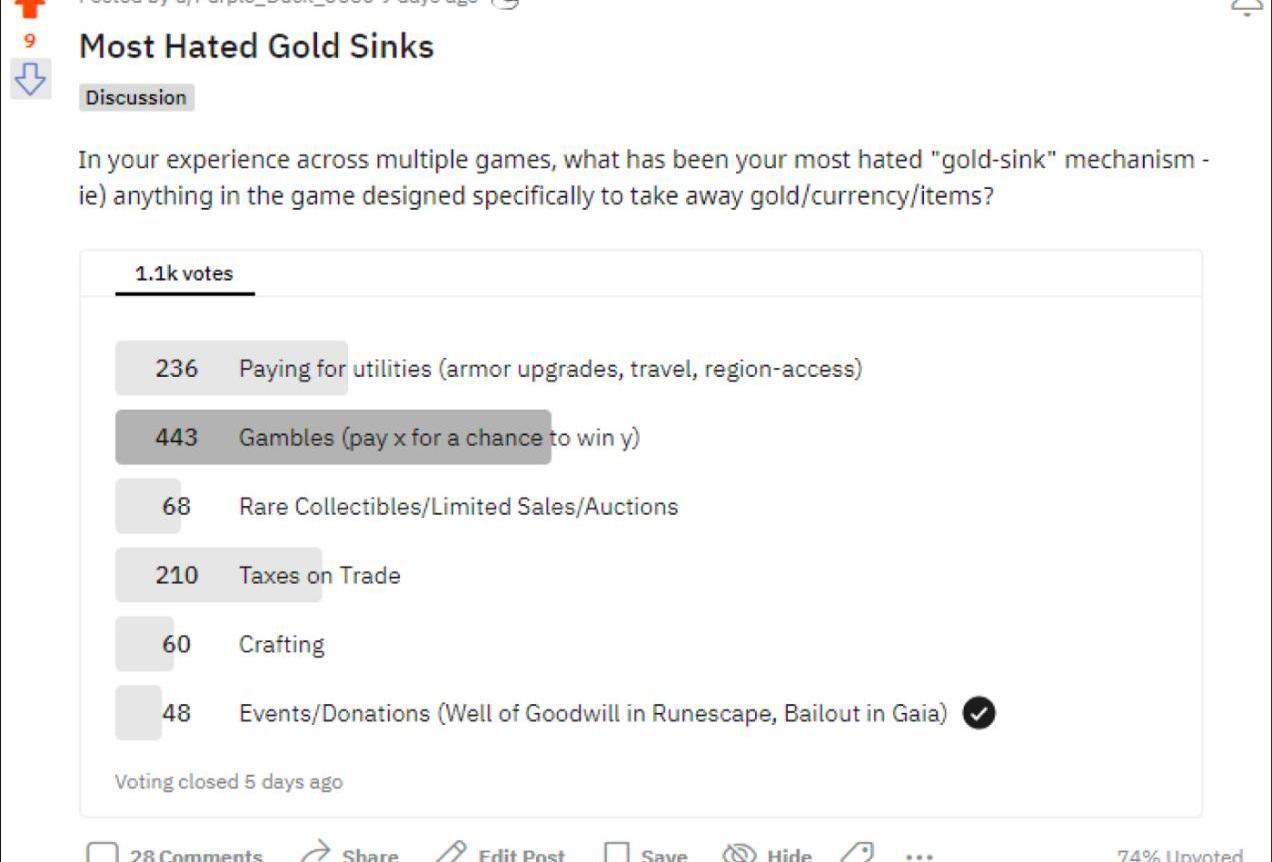 從我們的調查來看,賭博機制是迄今為止最令人討厭的游戲貨幣回收形式。我們猜測,這是因為許多游戲創造了付費獲勝的途徑。