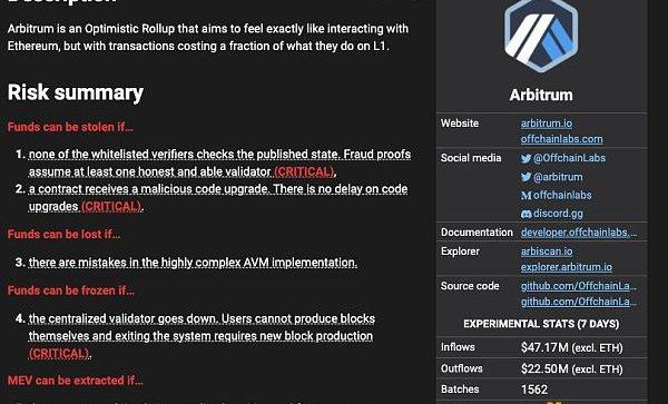 上圖:L2Beat.com網站對于Arbitrum網絡的風險總結。?