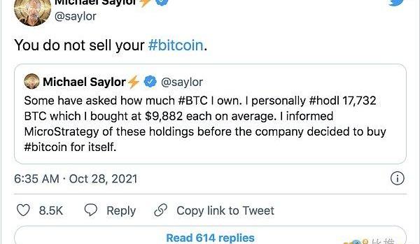 與其他不愿意透露個人投資的CEO不同,Saylor在10月底公開表示他個人持有17,732BTC——目前價值超過8.32億美元。