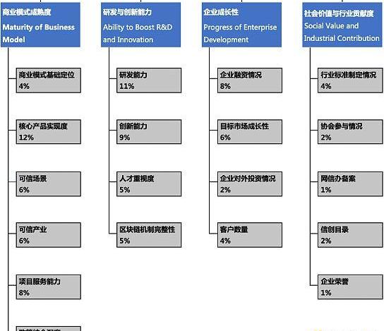 行業價值與社會貢獻度為唯一一個評分下降明顯的一級指標,主要是由于本期的MAPS?模型對重要指標進行了調整,將進入信創情況進行考核。自主可控和信息安全為信創產業的目標,進入信創目錄對自主創新發展的區塊鏈企業來說是一個很突出的加分項。迭代后,網信辦備案的一部分分值將賦予該指標,而網信辦備案部分分值從3分降到1分。上述對兩項指標的調整稀釋了網信辦備案情況較高的評分權重,最終使大部分企業的評分出現較大幅度下降。